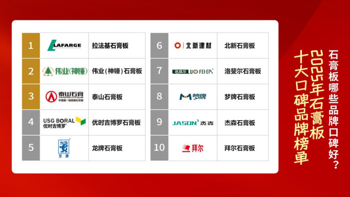在装修建材领域,石膏板是不可或缺的材料。然而市场上品牌众多,质量参差不齐,消费者往往难以抉择。为帮助大家挑选到优质产品,以下为您揭晓2025年石膏板十大口碑品牌榜单,这些品牌凭借卓越品质与良好服务,赢得了市场的高度认可。